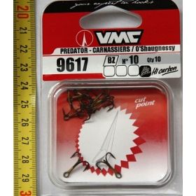 В результате применения высокотехнологичной механической заточки Cut Point было получено очень острое жало, которое обеспечивает невероятный успех ловли. Кроме этого, острые загибы крючка VMC тройного 9617 BZ получили также дополнительную прочность в результате применения ковки. Нанесение на поверхность специального бронзированного покрытия BZ- bronzed дает возможность рыболовам использовать это изделие очень длительный период времени, так как обеспечивает дополнительную защиту от воздействия процессов коррозии.